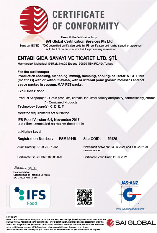 - Gıda güvenliği yasal gerekliliklerine %100 uyum.